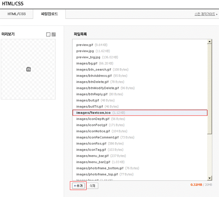 HTML/CSS편집에서 업로드 탭을 여시고, +추가를 이용해서 만들어둔 favicon.ico를 업로드합니다.