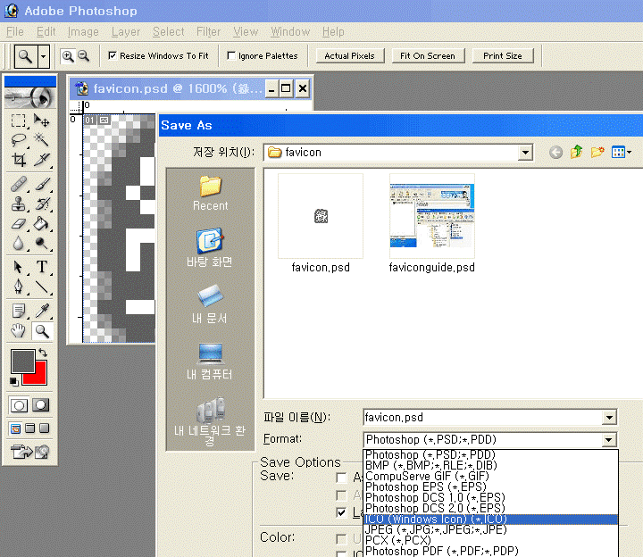 ico format 플러그인이 설치되어 있으면 위와 같이 Save As로 저장할 때 ico포맷으로 저장할 수 있어요.